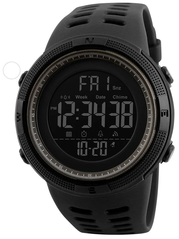 Современные спортивные часы Skmei 1251. Корпус противоударный, что с легкостью переносит любые удары и падение с высоты. Данная модель совместила в себе все необходимые функции: будильник, почасовой сигнал, таймер, секундомер, 12 и 24 часовой режим отображения времени. Водостойкость до 5 ATM, можно мыть руки и плавать. Характеристики: Механизм часов: цифровой Цвет подсветки: зелёный Материал ремешка: полиуретан Материал корпуса: Сталь, пластик, акрил Водостойкость: 5 ATM Отображение даты: есть Режим отображения времени: 12/24 Двойное время (Dual Time): есть Таймер: есть Будильник: есть Секундомер: есть По часовой сигнал: есть Максимальная длина браслета: 25 см Диаметр циферблата: 49 мм Высота циферблата: 15 мм Ширина ремешка: 22 мм Вес без упаковки: 57 гр Тип батарейки: CR2032